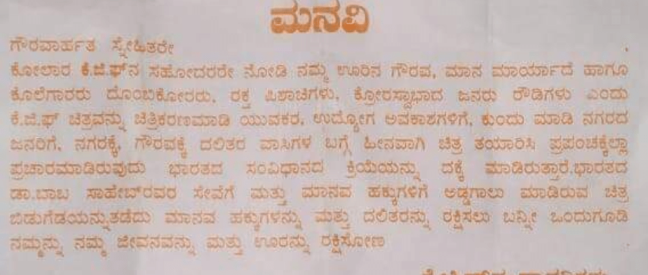 ಎಲ್ಲವೂ ಸರಿಯಾಗಿ ಇನ್ನೇನು ಪ್ರಪಂಚಾದ್ಯಂತ ನಾನಾ ಭಾಷೆಗಳಲ್ಲಿ ಕೆಜಿಎಫ್ ಚಲನಚಿತ್ರ ಬಿಡುಗಡೆಯಾಗುತ್ತಿರುವ ಸಂದರ್ಭದಲ್ಲಿ ಯಾರೂ ಅನಾಮದೇಯರು ಕೆಜಿಎಫ್ ನಾಗರೀಕರು ಎನ್ನುವ ಅನಾಮದೇಯ ಪತ್ರದ ಮೂಲಕ ಊರಿನ ಮರ್ಯಾದೆ, ಗೌರವಕ್ಕೆ ಧಕ್ಕೆ ತರುತ್ತಿದೆ ಎನ್ನುತ್ತಾ ಅನವಶ್ಯಕವಾಗಿ ಈ ವಿಷಯದಲ್ಲಿ ಅಂಬೇಡ್ಕರ್ ಮತ್ತು ಸಂವಿಧಾನವನ್ನು ಎಳೆತಂದು ದಲಿತರನ್ನು ಎತ್ತಿ ಕಟ್ಟಿ ತಮ್ಮ ಬೇಳೆ ಬೇಯಿಸಿಕೊಳ್ಳಲು ಪ್ರಯತ್ನಿಸುತ್ತಿರುವುದು ನಿಜಕ್ಕೂ ಕಳವಳಕಾರಿಯಾಗಿದೆ.