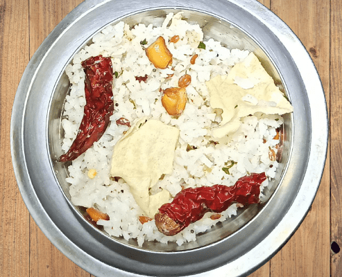 - ಈಗ ಕರಿದ ಹಪ್ಪಳವನ್ನು ಹುಡಿ ಮಾಡಿಕೊಂಡು ಕಲೆಸಿಟ್ಟುಕೊಂಡ ಅನ್ನಕ್ಕೆ ಬೆರೆಸಿದಲ್ಲಿ ಬಿಸಿ ಬಿಸಿಯಾದ ಮತ್ತು ಅಷ್ಟೇ ರುಚಿಯಾದ ಸಾಂಪ್ರದಾಯಕ ತುಪ್ಪಾನ್ನ ಸವಿಯಲು ಸಿದ್ಧ.