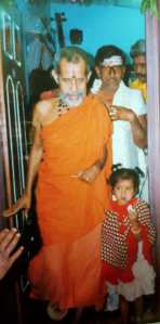 ಮಳೇ ನಿಂತೂ ಹೋದ ಮೇಲೂ ಮರದಡಿಯಲ್ಲಿ ಹನಿ ಬೀಳುವಂತೆ ನಮ್ಮ ತಂದೆಯವರ ಬುಸು ಬುಸು ಗುಟ್ಟುವಿಕೆ ಸ್ವಲ್ಪ ಕಾಲ ಇದ್ದು ನಂತರ ತಣ್ಣಗಾಗಿ ಮಾರನೇ ದಿನ ಯಥಾ ಪ್ರಕಾರ ಕಾರ್ಖಾನೆಗೆ ಹೋಗಿ ಸಂಜೆ ಮನೆಗೆ ಬಂದು ಸ್ವಾಮೀಜಿಗಳ ಬರುವಿಕೆಗೆ ಸಿದ್ದತೆ ಮಾಡಿಕೊಳ್ಳುತ್ತಿದ್ದಾಗಲೇ ಮನೆಯ ಮುಂದೆ ಕಾರ್ ನಿಂತ ಶಬ್ಧವಾಯಿತು. ಅರೇ ಈ ಸಮಯದಲ್ಲಿ ಯಾರಪ್ಪಾ ಬಂದಿದ್ದು ಎಂದು ನೋಡ ನೋಡುತ್ತಿದ್ದಂತೆಯೇ ಪೇಜಾವರ ಶ್ರೀಗಳು ಕಾರಿನಿಂದ ಇಳಿದು ನಮ್ಮ ಮನೆಯ ಗೇಟ್ ಮುಂದೆ ನಿಂತಿದ್ದನ್ನೂ ನೋಡಿದಾಕ್ಷಣ ನಮ್ಮ ತಂದೆಯವರ ಜಂಘಾಬಲವೇ ಇಳಿದು ಹೋಗಿತ್ತು ಎನ್ನುವುದನ್ನು ವಿವರಿಸಬೇಕಿಲ್ಲ. ಯಾವುದೇ ಪೂರ್ವನಿರ್ಧಾರಿತವಾಗಿರದೇ ಸ್ವಾಮಿಗಳು ಇದ್ದಕ್ಕಿಂದ್ದಂತೆಯೇ ನಿಗಧಿತ ಮನೆಯವರ ಮನೆಗೆ ಹೋಗುವ ಮುಂಚೆಯೇ ನಮ್ಮ ಮನೆಗೆ ಬಂದಿದ್ದ ಕಾರಣ ನಾವೆಲ್ಲರೂ ಒಂದು ಕ್ಷಣ ದಿಗ್ರಾಂಭತರಾಗಿದ್ದಂತೂ ಸತ್ಯ. ಎಲ್ಲವನ್ನೂ ಸಾವರಿಸಿಕೊಂಡು ಕೂಡಲೇ ಮನೆಯೊಳಗೆ ಕರೆದುಕೊಂಡು ಅವರಿಗೆ ಯಥಾಶಕ್ತಿ ಸತ್ಕರಿಸಿ ಕಾಣಿಕೆಯನ್ನು ನೀಡಿ ಧನ್ಯತಾಭಾವವನ್ನು ಅರ್ಪಿಸಿದ್ದೆವು. ಶ್ರೀಗಳೂ ಸಹಾ ತುಂಬು ಹೃದಯದಿಂದ ನಮ್ಮೆಲ್ಲರನ್ನೂ ಅಶೀರ್ವದಿಸಿ, ಶೀಘ್ರಮೇವ ಕಲ್ಯಾಣ ಪ್ರಾಪ್ತಿರಸ್ತು ಎಂದು ನನಗೆ ಆಶೀರ್ವದಿಸಿದ್ದಲ್ಲದೇ ಅಲ್ಲಿಯೇ ಇದ್ದ ನನ್ನ ತಂಗಿಯ ಮಗಳಿಗೆ ತಮ್ಮ ಕೈಯ್ಯಾರೆ ಫಲಮಂತ್ರಾಕ್ಷತೆ ನೀಡಿ ಆಶೀರ್ವದಿಸಿದರು. ಏನನ್ನೂ ಅರಿಯದ ಆ ಪುಟ್ಟ ಕಂದ ಕೂಡಲೇ ಬಾಳೇಹಣ್ಣನ್ನು ಸುಲಿದು ಸ್ವಾಮಿಗಳ ಮುಂದೆಯೇ ತಿನ್ನುತ್ತಿರುವುದನ್ನು ಈ ಚಿತ್ರದಲ್ಲಿ ಕಾಣಬಹುದಾಗಿದೆ.