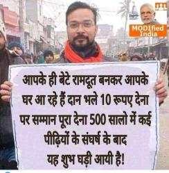ನಮ್ಮಂತಹ ಕಾರ್ಯಕರ್ತರು ನಿಮ್ಮ ಮನೆಗೂ ಬರಬಹುದು. ಅವರಿಗೆ ಇಷ್ಟೇ ಅಷ್ಟೇ ಕೊಡಬೇಕು ಅಂತೇನೂ ಇಲ್ಲಾ. ನಿಮ್ಮಿಷ್ಟ ಬಂದಷ್ಟು ಕೊಡಿ. ಕಡೇ ಪಕ್ಷ ಏನನ್ನೂ ಕೊಡಲು ಸಾಧ್ಯವಾಗದಿದ್ದರೂ ಪರವಾಗಿಲ್ಲ ಅವರ ಜೊತೆ ಒಂದು ಜೈ ಶ್ರೀರಾಮ್ ಎಂದು ಜಯಕಾರ ಹಾಕಿ ಸಾಕು ನೀವು ಸಹಾ ಅಭಿಯಾನಲ್ಲಿ ಪಾಲ್ಗೊಂಡಂತಾಗುತ್ತದೆ. ಅದಕ್ಕೇ ಏನೋ ನಮ್ಮಮ್ಮ ಚಿಕ್ಕವಯಸ್ಸಿನಲ್ಲಿ ಹೇಳಿ ಕೊಟ್ಟಿದ್ರೂ, ಕಲಿಯುಗದೊಳು ಹರಿನಾಮವ ನೆನೆದರೆ ಕುಲಕೋಟಿಗಳುದ್ಧರಿಸುವುವು.