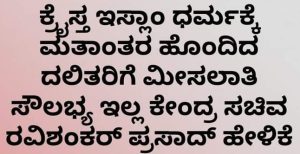 ಇಂದು ರಾಜ್ಯಸಭೆಯಲ್ಲಿ ಪ್ರಶ್ನೆಯೊಂದಕ್ಕೆ ಉತ್ತರಿಸುತ್ತಾ ಕೇಂದ್ರದ ಕಾನೂನು ಮಂತ್ರಿಗಳಾದ ಶ್ರೀ ರವಿಶಂಕರ್ ಪ್ರಸಾದ್ ಅವರು ದಲಿತರು ಕ್ರೈಸ್ತ ಅಥವಾ ಇಸ್ಲಾಂ ಧರ್ಮಕ್ಕೆ ಮತಾಂತರ ಹೊಂದಿದಲ್ಲಿ ಅಂತವರಿಗೆ ಇನ್ನು ಯಾವುದೇ ಮೀಸಲಾತಿ ಸೌಲಭ್ಯ ಇರುವುದಿಲ್ಲ ಎಂದು ಸ್ಪಷ್ಟ ಪಡಿಸಿದಾಗ ಬಹಳ ವರ್ಷಗಳಿಂದ ಕಾಡುತ್ತಿದ್ದ ಜಿಜ್ಞಾಸೆಗೆ ಮುಕ್ತಿ ಕೊಟ್ಟಿತು ಎಂದರೂ ತಪ್ಪಾಗಲಾರದು.