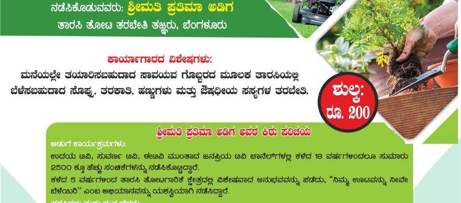 ನಾನು ಸಸ್ಯ ಪ್ರೇಮಿ, ಕಾರ್ಯಕ್ರಮ ಕೆ ಬರಲಾಗಿದೆ ಪರಿತಪಿಸಿ, ನಿಮ್ಮ ಮುಖೇನ ಕಾರ್ಯಕ್ರಮದ ಸವಿವರ ತಿಳಿದು ಸಂತೋಷ ಆಯ್ತು. ಮುಂದಿನ ಕಾರ್ಯಾಗಾರಕ್ಕೆ ಕಂಡಿತಾ ಬರುವೆ. Whatsapp group ge nanna number add madi.