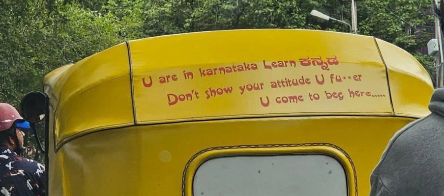 WhatsApp Image 2023-07-25 at 11.07.04ಆಟೋ ಬರಹಗಳ ಕುರಿತಾದ ಇಷ್ಟೆಲ್ಲಾ ಪೀಠಿಕೆ ಏಕಪ್ಪಾ ಅಂದ್ರೇ, ಇತ್ತೀಚೆಗೆ ಆಟೋ ಒಂದರ ಮೇಲಿನ ಈ ಬರಹ ಟ್ವಿಟರ್ ನಲ್ಲಿ ಬಹಳ ಟ್ರೆಂಡ್ ಆಗಿದ್ದು ಅದರ ಪರ ಮತ್ತು ವಿರೋಧಗಳ ಕುರಿತಾಗಿ ಬಹಳಷ್ಟು ಸದ್ದು ಮಾಡುತ್ತಿದೆ. ಇತ್ತೀಚೆಗೆ ಕರ್ನಾಟಕದಲ್ಲಿ ಕನ್ನಡ ಭಾಷೆಯ ಹೆಸರಿನಲ್ಲಿ ಇಲ್ಲಸಲ್ಲದ ಅಕ್ಷೇಪಗಳನ್ನು ಮಾಡುತ್ತಾ, ಸಮಾಜದ ಸ್ವಾಸ್ಥ್ಯವನ್ನು ಹಾಳು ಮಾಡಿ ತಮ್ಮ ಬೇಳೆ ಬೇಯಿಸಿಕೊಳ್ಳುವವರ ಸಂಖ್ಯೆ ಹೆಚ್ಚಾಗುತ್ತಿತ್ತು ಅದರ ಮುಂದುವರೆದ ಭಾಗದಂತೆ, ಪರಭಾಷಿಕರನ್ನು ಕೆಣಕಲೆಂದೇ ಬೆಂಗಳೂರಿನ ಆಟೋ ಚಾಲಕನೊಬ್ಬ ತಮ್ಮ ಆಟೋ ಹಿಂದೆ ‘You are in Karnataka, learn Kannada. Don’t show your attitude, you f*******. You have come to beg here. ಅಂದರೆ, ನೀನು ಕರ್ನಾಟಕದಲ್ಲಿರುವೆ. ಕನ್ನಡ ಕಲಿ. ಅಹಂಕಾರ ತೋರಿಸಬೇಡ. ನೀನು ಇಲ್ಲಿಗೆ ಭಿಕ್ಷೆ ಬೇಡಲು ಬಂದಿದ್ದೀಯಾ ಎಂಬುದರ ಜೊತೆಗೆ ಅಶ್ಲೀಲಕರ ಪದವೊಂದನ್ನು ಸಹಾ ಬಳಸಿರುವ ಬರಹವೊಂದು, ಅನ್ಯಭಾಷಿಗರಿಗೆ ನೀಡಿದ ನೈತಿಕ ಪೋಲೀಸ್ ಗಿರಿಯ ಎಚ್ಚರಿಕೆ  ಈಗ ಎಲ್ಲೆಲ್ಲೂ ವೈರಲ್ ಆಗಿ, ಸಾಮಾಜಿಕ ಜಾಲತಾಣಗಳಲ್ಲಿ ಅದರ ಪರ ವಿರೋಧದ ಚರ್ಚೆ ಕೂಡ ಆರಂಭವಾಗಿದೆ. ಈ ಬರಹದ ಕುರಿತು ಪರಭಾಷಿಕರು ತೀವ್ರವಾಗಿ ವಿರೋಧ ವ್ಯಕ್ತಪಡಿಸಿದರೆ, ಅದನ್ನು ಸಮರ್ಥನೆ ಮಾಡಿಕೊಳ್ಳಲು ಕೆಲವು ಕೆಚ್ಚದೆಯ ಕನ್ನಡಿಗರು ಸಹಾ ಮುಂದಾಗಿರುವುದು ಒಂದು ರೀತಿಯ ಆಭಾಸಕ್ಕೆ ಎಡೆ ಮಾಡಿಕೊಟ್ಟಿದೆ ಎಂದರೂ ತಪ್ಪಾಗದು.