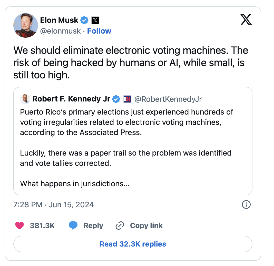 ಈ ಬಾರಿಯ ಚುನಾವಣೆಯಲ್ಲಿ INDI ಮತ್ತು NDA ಒಕ್ಕೂಟ ಬಹುತೇಕ ಸರಿ ಸಮಾನವಾದ ಸ್ಥಾನಗಳನ್ನು ಪಡೆದ ಕಾರಣ ಈಗಾಗಲೇ ತಿಳಿಸಿದಂತೆ EVM ಮಷೀನ್ಗಳ ಬಗ್ಗೆ ಹೆಚ್ಚಿನ ಆರೋಪಗಳು ಭಾರತದ ರಾಜಕಾರಣಿಗಳಿಂದ ಕೇಳಿ ಬರಲಿಲ್ಲವಾದರೂ, ಹೋದ್ಯಾ ಪಿಚಾಚಿ ಅಂದ್ರೇ ಬಂದೇ ಗವಾಕ್ಷಿಲೀ ಎನ್ನುವ ಹಾಗೆ ಜಗತ್ತಿನ ಅತ್ಯಂತ ಶ್ರೀಮಂತ ವ್ಯಕ್ತಿ ಎನಿಸಿಕೊಂಡಿರುವ ಟೆಸ್ಲಾ ಮುಖ್ಯಸ್ಥ ಎಲಾನ್ ಮಸ್ಕ್ ಪೋರ್ಟೋ ರಿಕೋದಲ್ಲಿ ನಡೆದ ಚುನಾವಣಾ ಅಕ್ರಮ ಪ್ರಸ್ತಾಪಿಸುತ್ತಾ, ಇವಿಎಂಗಳನ್ನು ಹ್ಯಾಕ್ ಮಾಡುವ ಸಾಧ್ಯತೆ ಇರುವ ಕಾರಣ, ಭಾರತದ ಚುನಾವಣೆಗಳಲ್ಲಿ ವಿದ್ಯುನ್ಮಾನ ಮತ ಯಂತ್ರ ಬಳಕೆ ಮಾಡದಂತೆ ಎಲಾನ್ ಮಸ್ಕ್ ಸಲಹೆ ನೀಡಿರುವುದು ಅಚ್ಚರಿಯನ್ನು ಮೂಡಿಸಿದೆ.