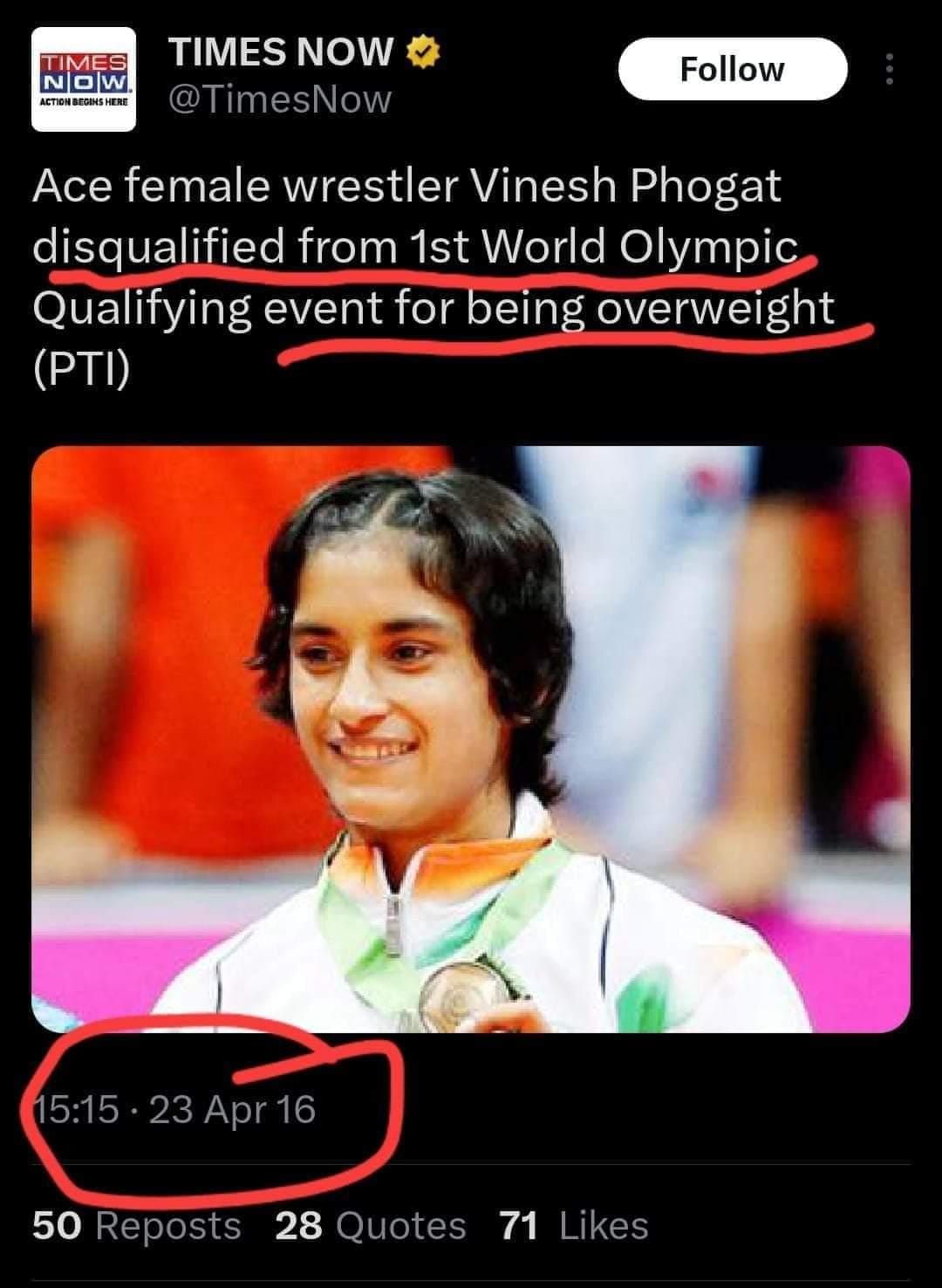 ಅನುಭವಿ ಕುಸ್ತಿಪಟು ವಿನೇಶ್ ಫೋಗಟ್ ಹೀಗೆ ಅಧಿಕ ತೂಕದಿಂದ ಸ್ಪರ್ಧೆಯಿಂದ ಅನರ್ಹರಾಗಿದ್ದು ಇದೇ ಮೊದಲಲ್ಲ. ಸಾಮಾನ್ಯವಾಗಿ 53 ಕೆಜಿ ವಿಭಾಗದಲ್ಲಿ ಸ್ಪರ್ಧಿಸುವ ಫೋಗಟ್ 2020ರ ಒಲಿಂಪಿಕ್ ಅರ್ಹತಾ ಪಂದ್ಯಗಳಲ್ಲಿಯೂ ಇದೇ ತೂಕದ ಕಾರಣಕ್ಕಾಗಿ ಹಿನ್ನಡೆ ಅನುಭವಿಸಿದ್ದರು. ನಂತರದ ದಿನಗಳಲ್ಲಿ ತಮ್ಮ ತೂಕವನ್ನು ಕಡಿಮೆ ಮಾಡಿಕೊಂಡ ವಿನೇಶ್ 50 ಕೆಜಿ ವಿಭಾಗದಲ್ಲಿ ಸ್ಪರ್ಧಿಸಿ ಮತ್ತೇ ಅದೇ ರೀತಿ ಅರ್ನಹಗೊಂಡಿರುವುದು ನಿಜಕ್ಕೂ ಅಕ್ಷಮ್ಯ ಅಪರಾಧವಾಗಿದೆ.