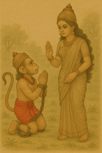 ತನ್ನ ತಾಯಿಯ ಈ ರೀತಿಯಾದ ಹಠಾತ್ ಕೆಲಸದಿಂದ ತುಸು ಬೇಸರಗೊಂಡ ಆಂಜನೇಯ, ಅಮ್ಮಾ! ಈ ಬೇಡಿಗಳಿಂದ ನನಗೆ ಎಂದು ಮುಕ್ತಿ ದೊರೆಯುತ್ತದೆ? ಎಂದು ಕೇಳಿದಾಗ, ಅಯ್ಯೋ, ಕಂದಾ! ಬೇಸರ ಮಾಡಿ ಕೊಳ್ಳದಿರು. ನಿನ್ನ ಮೇಲಿನ ಪ್ರೀತಿ ಮತ್ತು ಕಾಳಜಿಯಿಂದ ನೀನು ಎಲ್ಲೂ ಹೋಗಬಾರದೆಂದು ಈ ರೀತಿಯಾಗಿ ಕಟ್ಟಿ ಹಾಕಿದ್ದೇನೆ. ಈಗ ತುರ್ತು ಕೆಲಸಕ್ಕಾಗಿ ಹೊರಗೆ ಹೋಗುತ್ತಿದ್ದು, ಅಲ್ಲಿಂದ ಹಿಂದುರಿಗಿದ ಕೂಡಲೇ ನಿನ್ನನ್ನು ಬಂಧನದಿಂದ ಮುಕ್ತಿ ಗೊಳಿಸುತ್ತೇನೆ ಎಂದು ಹೇಳಿ ತನ್ನ ಪಾಡಿಗೆ ತಾನು ಹೋಗಿ ಬಿಡುತ್ತಾರೆ.