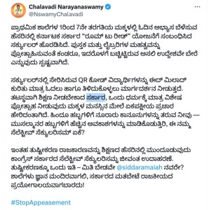 ಇಂತಹ ಸುಂದರವಾದ ಪರಿಕಲ್ಪನೆಯನ್ನು ಹೊಂದಿರುವ ಕಾರ್ಯಕ್ರಮದಲ್ಲಿ ಹಾಲಿನಲ್ಲಿ ಹುಳಿ ಹಿಂಡಿದಂತೆ ಪ್ರಾಥಮಿಕ ಶಾಲೆಗಳ 1ರಿಂದ 7ನೇ ತರಗತಿಯ ಮಕ್ಕಳಲ್ಲಿ ಓದಿನ ಅಭ್ಯಾಸ ಬೆಳೆಸುವ ಹೆಸರಿನಲ್ಲಿ ಕರ್ನಾಟಕ ಸರ್ಕಾರ ರೂಮ್ ಟು ರೀಡ್ ಯೋಜನೆಗೆ ಸಂಬಂಧಿಸಿದಂತೆ ಹೊರಡಿಸಿರುವ ಸುತ್ತೋಲೆಯು ಮಕ್ಕಳಲ್ಲಿ ಓದುವ ಹವ್ಯಾಸವನ್ನು ಪ್ರೋತ್ಸಾಹಿಸುವಂತೆ ಕಂಡರೂ, ಆ ಸುತ್ತೋಲೆಯಲ್ಲಿರುವ QR ಕೋಡ್ ವಿದ್ಯಾರ್ಥಿಗಳಿಗೆ ಕೇವಲ ಈದ್ ಮಿಲಾದ್ ಕುರಿತಾಗಿ ಮಾತ್ರ ಓದಲು ಹಾಗೂ ತಿಳಿದುಕೊಳ್ಳಲು ಮಾರ್ಗದರ್ಶನ ನೀಡುತ್ತಿರುವುದು ನಿಜಕ್ಕೂ ಆಘಾತಕಾರಿಯಾಗಿದೆ. ಮಾತೆತ್ತಿದರೆ ಹೋದ ಬಂದ ಕಡೆಯಲ್ಲೆಲ್ಲಾ ಬಾಬಾ ಸಾಹೇಬ್ ಅಂಬೇಡ್ಕರ್ ಅವರ ಸಂವಿಧಾನ ಎಂದು ಕೆಂಪು ಪುಸ್ತಕವನ್ನು ಪ್ರದರ್ಶಿಸುವ ( ಆ ಪುಸ್ತಕದಲ್ಲಿ ಏನಿದೆ ಎನ್ನುವುದನ್ನು ಬಿಡಿ, ಅದರಲ್ಲಿ ಎಷ್ಟು ಪುಟಗಳಿವೆ? ಎಂದು ಸಂಸತ್ತಿನಲ್ಲಿ ಅನುರಾಗ್ ಠಾಕೂರ್ ಕೇಳಿದ ಪ್ರಶ್ನೆಗೆ ಬೆಬ್ಬೆಬ್ಬೇ ಎಂದವರು) ಸಂವಿಧಾನದ ರಕ್ಷಕರು ತಾವೇ ಎನ್ನುವ, ತಾವು ಮಾತ್ರಾ ಜಾತ್ಯಾತೀತರು ಉಳಿದವರೆಲ್ಲರೂ ಕೋಮುವಾದಿಗಳು ಎನ್ನುವ ಇದೇ ಸಿದ್ದರಾಮಯ್ಯನವರು ಯಾವುದೇ, ಧರ್ಮದ ಪರವಾಗಿರದೇ, ತಟಸ್ಥವಾಗಿ ಶಿಕ್ಷಣ ನೀಡಬೇಕಾದ ಅವರದ್ದೇ ಸರ್ಕಾರ ಏನೂ ಅರಿಯದ ಆ ಪುಟ್ಟ ವಯಸ್ಸಿನ ಮಕ್ಕಳಿಗೆ ಕೇವಲ ಒಂದು ಧರ್ಮಕ್ಕೆ ಮಾತ್ರ ವಿಶೇಷ ಪ್ರೋತ್ಸಾಹ ನೀಡುವ ಮೂಲಕ ಮಕ್ಕಳ ಮನಸ್ಸಿನ ಮೇಲೆ ಏಕಪಕ್ಷೀಯ ಪ್ರಚಾರ ಹೇರಿದಂತಾಗುವುದಲ್ಲದೇ?