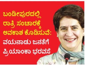 ಇನ್ನು ಕರ್ನಾಟಕ ಮತ್ತು ಕೇರಳದ ನಡುವೆ ಇರುವ ಬಂಡೀಪುರ ಅಭಯಾರಣ್ಯದಲ್ಲಿ ಮಾನವ–ಪ್ರಾಣಿ ಸಂಘರ್ಷ ಬಹಳವಾಗಿದ್ದು, ರಾತ್ರಿಯ ವೇಳೆಯಲ್ಲಿ ಅಲ್ಲಿ ವಾಹನ ಸಂಚಾರಕ್ಕೆ ಅವಕಾಶ ಕಲ್ಪಿಸುವುದರಿಂದ ವನ್ಯ ಜೀವಿಗಳು ಸಾವನ್ನಪ್ಪುತ್ತಿದ್ದದ್ದನ್ನು ತಪ್ಪಿಸುವ ಸಲುವಾಗಿ ಆ ರಾಷ್ಟ್ರೀಯ ಹೆದ್ದಾರಿ 766ರಲ್ಲಿ ರಾತ್ರಿ 9 ಗಂಟೆಯಿಂದ ಬೆಳಗ್ಗೆ 6 ಗಂಟೆ ವರೆಗೆ ರಾತ್ರಿ ಸಂಚಾರವನ್ನು ಕರ್ನಾಟಕ ಸರ್ಕಾರ ಬಹಳ ದಿನಗಳಿಂದಲೂ ನಿಷೇಧಿಸಿದಾಗ, ಆ ಭಾಗದಲ್ಲಿ ರಾತ್ರಿ ವೇಳೆ ಸಂಚಾರಕ್ಕೆ ಅವಕಾಶ ಕಲ್ಪಿಸಬೇಕೆಂದು ಕೇರಳ ಸರ್ಕಾರ ಹಲವು ವರ್ಷಗಳಿಂದಲೂ ಒತ್ತಡ ಹೇರುತ್ತಲೇ ಇತ್ತು. ಕರ್ನಾಟಕ ಕಾಂಗ್ರೇಸ್ಸಿಗರ ಆರ್ಥಿಕ ಕೃಪೆಯಿಂದ ರಾಹುಲ್ ರಾಜೀನಾಮೆ ನೀಡಿದ ವಯನಾಡ್ ಕ್ಷೇತ್ರದ ಉಪಚುನಾವಣೆಯಲ್ಲಿ ಪ್ರಿಯಾಂಕ ಆಯ್ಕೆಯಾಗಿ ಸಂಸದೆಯಾಗಿ ಆಯ್ಕೆಯಾಗುತ್ತಿದ್ದಂತೆಯೇ, ಬಂಡೀಪುರದಲ್ಲಿ ರಾತ್ರಿ ವೇಳೆ ಸಂಚಾರಕ್ಕೆ ಅವಕಾಶ ಕೊಡುವುದೇ ತನ್ನ ಮೊದಲ ಆದ್ಯತೆಯಾಗಿ ತೆಗೆದುಕೊಂಡು ಕರ್ನಾಟಕದಲ್ಲಿ ನಮ್ಮದೇ ಸರ್ಕಾರವಿದ್ದು, ಅವರು ಅಲ್ಲಿ ರಾತ್ರಿ ಸಂಚಾರ ನಿರ್ಬಂಧಿಸಿರುವುದರಿಂದ ಆಗುತ್ತಿರುವ ಸಮಸ್ಯೆ ತನಗೆ ಗೊತ್ತಿದ್ದು, ಆ ವಿಷಯವನ್ನು ನನಗೆ ಬಿಟ್ಟು ಬಿಡಿ. ಅಲ್ಲಿ ಸಂಚಾರಕ್ಕೆ ಅವಕಾಶ ಕಲ್ಪಿಸುವುದು ನನ್ನ ಜವಾಬ್ದಾರಿ ಎಂದು ಹೇಳುವ ಮೂಲಕ ಕರ್ನಾಟಕದ ವನ್ಯಜೀವಿಗಳನ್ನು ಮತ್ತು ಕನ್ನಡಿಗರ ಆಶಯಗಳನ್ನು ಕಾಂಗ್ರೇಸ್ಸಿಗರು ಬಹಳ ಲಘುವಾಗಿ ತೆಗೆದುಕೊಳ್ಳುತ್ತಿರುವುದು ಸ್ಪಷ್ಟವಾಗಿ ಕಾಣಿಸುತ್ತಿದೆಯಲ್ಲವೇ?