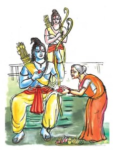 ಅಯ್ಯೋ ಅದೆಷ್ಟು ದೂರದಿಂದ ನಡೆದುಕೊಂಡು ಬಂದ್ದೀದ್ದೀರೋ ನಾಕಾಣೆ. ಸಾಕಷ್ಟು ದಣಿವಾಗಿರಬಹುದು ಮತ್ತು ಹೊಟ್ಟೆಯೂ ಹಸಿದಿರಬಹುದು. ಹೋಗಿ ಅಲ್ಲಿರುವ ನೀರಿನಲ್ಲಿ ಕೈಕಾಲು ತೊಳೆದುಕೊಂಡು ಬನ್ನಿ. ಆಷ್ಟರೊಳಗೆ ನಾನು ನಿಮಗೆ ರುಚಿಕರವಾದ ಫಲಾಹಾರವನ್ನು ಸಿದ್ಧ ಪಡಿಸುತ್ತೇನೆ ಎಂದು ಆ ಇಳೀ ವಯಸ್ಸಿನಲ್ಲೂ ರಾಮನನ್ನು ಕಂಡ ಹರುಷದಿಂದ ಸರ ಸರನೇ ಹೋಗಿ ರಾಮನಿಗಾಗಿಯೇ ಸಂಗ್ರಹಿಸಿ ತಂದಿದ್ದ ಗೆಡ್ಡೆ ಗೆಣಸುಗಳು ಮತ್ತು ಹಣ್ಣು ಹಂಪಲನ್ನು ತಂದು ರಾಮನ ಮುಂದಿಟ್ಟು ಬಹಳ ವಿನಮ್ರದಿಂದ ರಾಮಾ ಈ ಬಡವಿಯ ಆತಿಥ್ಯವನ್ನು ಸ್ವೀಕರಿಸು ಎಂದು ಕೋರಿಕೊಂಡಳು.