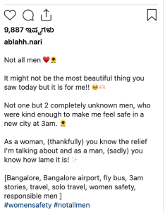 ತಡ ರಾತ್ರಿ 3 ರ ಸಮಯದಲ್ಲಿ ಇಬ್ಬರು ಅಪರಿಚಿತರು ತನಗಾಗಿ ತೋರಿದ ಔದಾರ್ಯತೆಗಾಗಿ ಕೃತಜ್ಞತಾ ಪೂರ್ವಕವಾಗಿ ಆಕೆ ಮಾಡಿರುವ ವಿಡಿಯೋಗೆ ಶೀರ್ಷಿಕೆಯಾಗಿ ಎಲ್ಲಾ ಗಂಡಸರೂ ಒಂದೇ ತರಹ ಇರುವುದಿಲ್ಲ. ಇಂದು ನೀವು ನೋಡಿದ ಅತ್ಯಂತ ಸುಂದರವಾದ ವಿಚಾರ ಇದಾಗದಿರಬಹುದು, ಆದರೆ ನನಗೆ ಇದು ನಿಜಕ್ಕೂ ವಿಶೇಷ. ನಡುರಾತ್ರಿ 3 ಗಂಟೆಗೆ ಹೊಸ ನಗರದಲ್ಲಿ ಇಬ್ಬರು ಅಪರಿಚಿತರು ನನಗೆ ತೋರಿದ ಕಾಳಜಿ ನನಗೆ ಸುರಕ್ಷತೆಯ ಭಾವನೆ ಮೂಡಿಸಿತು. ಒಬ್ಬಂಟಿ ಮಹಿಳೆಯಾಗಿ ಪ್ರಯಾಣಿಸುವಾಗ ಸಿಗುವ ಈ ನೆಮ್ಮದಿ ಎಂಥದ್ದು ಎಂಬುದು ಹೆಣ್ಣುಮಕ್ಕಳಿಗೆ ಮಾತ್ರ ಅರ್ಥವಾಗುತ್ತದೆ. ಇಂತಹ ಘಟನೆಗಳು ಅಪರೂಪ ಎಂಬುದು ನಿರಾಸೆ ಮೂಡಿಸಿದರೂ, ಇದು ನೆನಪಿನಲ್ಲಿ ಉಳಿಯುವಂತದ್ದು ಎಂದು ಹೇಳಿರುವಲ್ಲದೇ ಅದನ್ನೇ ಆಕೆ ತನ್ನ ಎಕ್ಸ್ ಖಾತೆಯಲ್ಲಿ ಲಗ್ಗತಿಸಿರುವುದು ಈ ಮೊದಲೇ ಹೇಳಿದಂತೆ ಎಲಾ ಕಡೆಯಲ್ಲೂ ವೈರಲ್ ಆಗಿದ್ದು ಜನರೂ ಸಹಾ ಬಹಳ ಮೆಚ್ಚುಗೆಯನ್ನು ವ್ಯಕ್ತಪಡಿಸುತ್ತಿದ್ದಾರೆ.